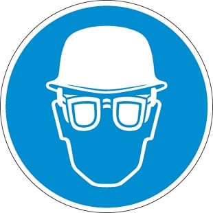 Fejvédő és védőszemüveg használata kötelező! munkavédelmi tábla. Szabványos biztonsági jelzés ipari és munkahelyi környezetbe.