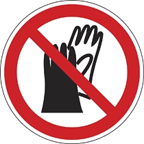 Védőkesztyű használata tilos! munkavédelmi tábla. Szabványos biztonsági jelzés ipari és munkahelyi környezetbe.